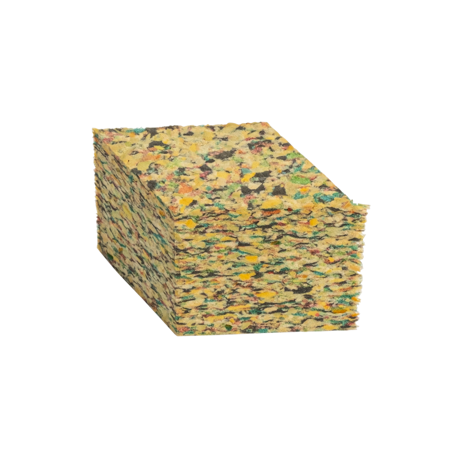OmschrijvingBonded foam wordt geproduceerd van gerecycled PU schuim (Polyether). Bonded foam staat ook wel bekend als rebonded, vlokkenschuim of composietschuim. Het versnipperde materiaal wordt met een bindmiddel in de mallen geplaatst en vervolgens samen geperst. Het gerecyclede materiaal kan in verschillende vormen worden gesneden en door de lage tot zeer hoge densiteiten, van ongeveer 60 kg/m³ tot en met 300 kg/m³, kan het voor diverse toepassingen gebruikt worden. Het Bonded foam is herkenbaar aan de diverse kleuren door elkaar. |